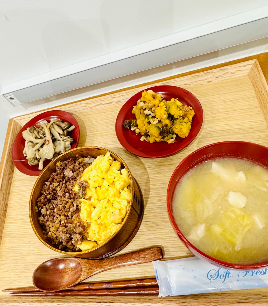 The rice is topped with ground pork soboro with a hint of ginger and eggs. The tempura is fuki no tō butterbur, a slightly bitter sansai mountain vegetable. The teuchi handmade soba is delicious.