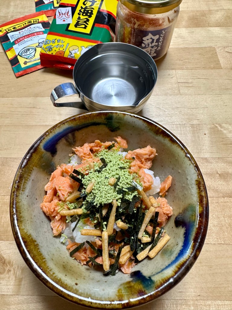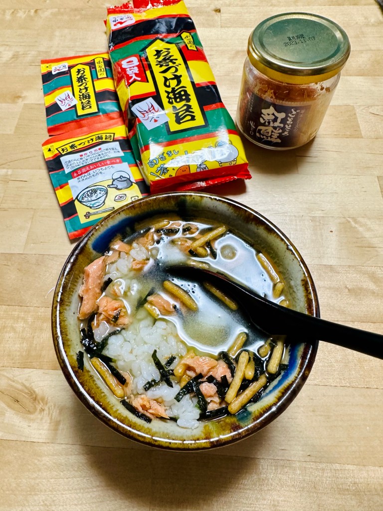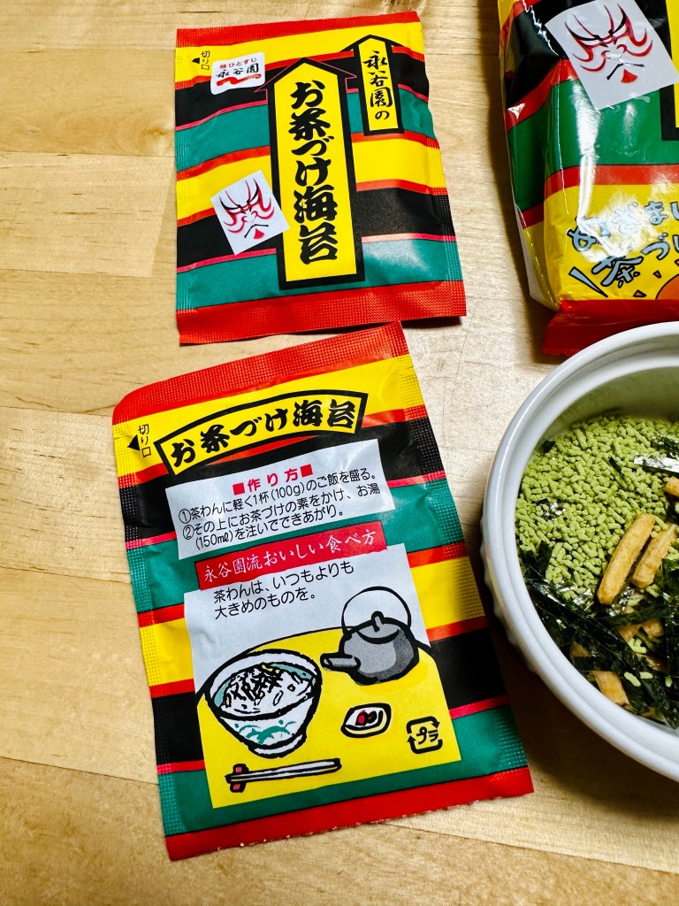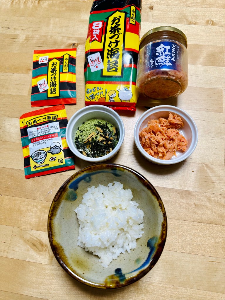 Ochazuké is a simple dish of rice with toppings like grilled salmon or uméboshi pickled apricot with green tea or a savory dashi (or a combination!). Nagatanien is a popular brand of ochazuké. It comes in three flavors: