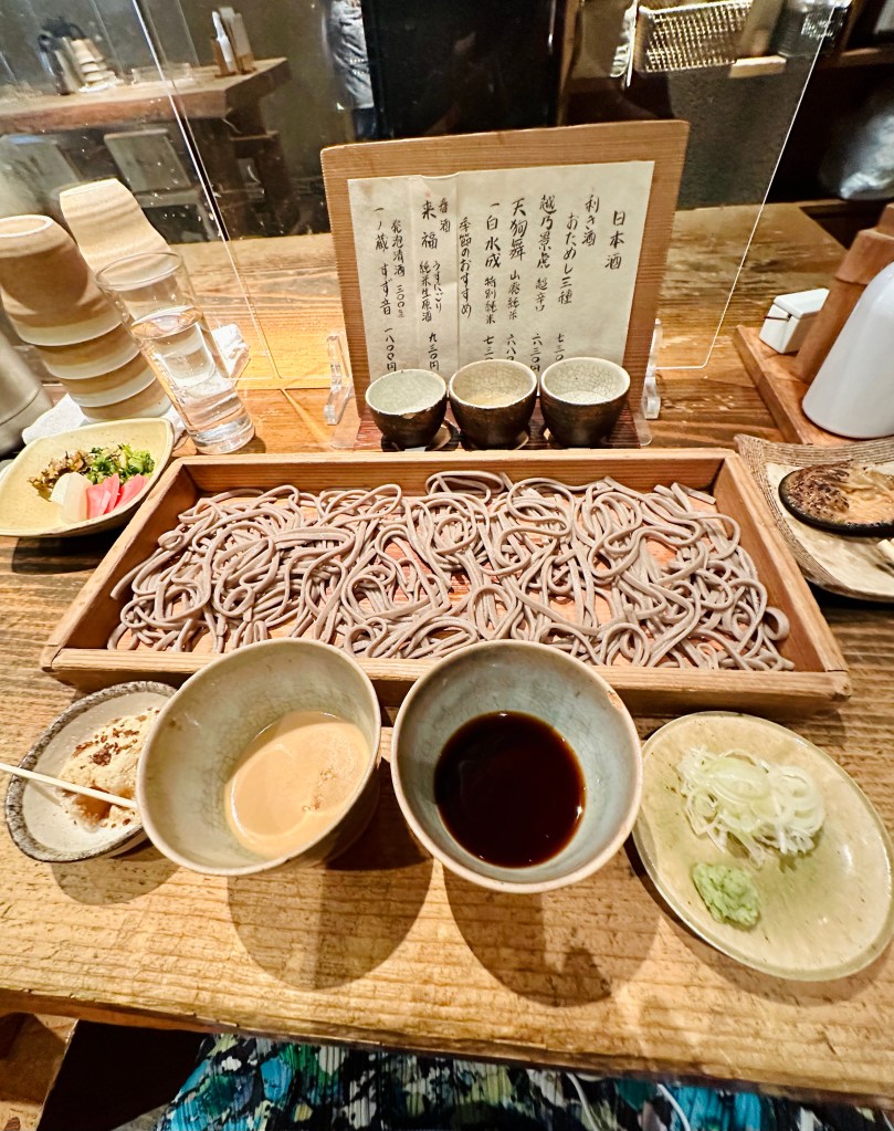 Had a fantastic soba meal at Ebisu Kaoriya. Started with a flight of saké. Included a half-order of dashimaki tamago savory omelet, soba yaki miso, and tsukemono pickles. All very good. My favorite is always the miso with buckwheat groats. This one included julienned ginger. These three dishes are lovely with the nihonshu.
