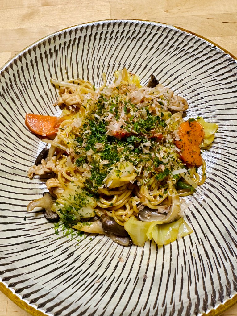 Yakisoba, stir-fried noodles, are a simple dish to make at home. We love the Maru-chan @maruchan_inc noodles that are sold in packs of three and include a powdered seasoning sauce. The noodles are delicious on its own, but most of the time we add pork and vegetables. A sprinkle of katsuobushi smoked skipjack tuna (also called bonito) flakes and aonori.