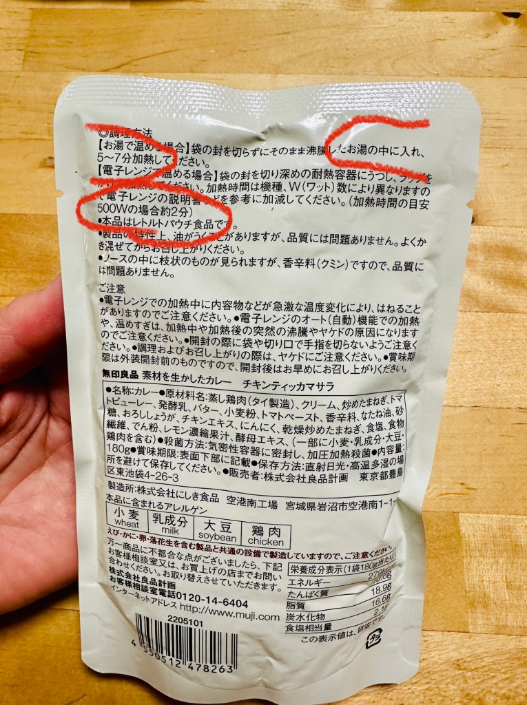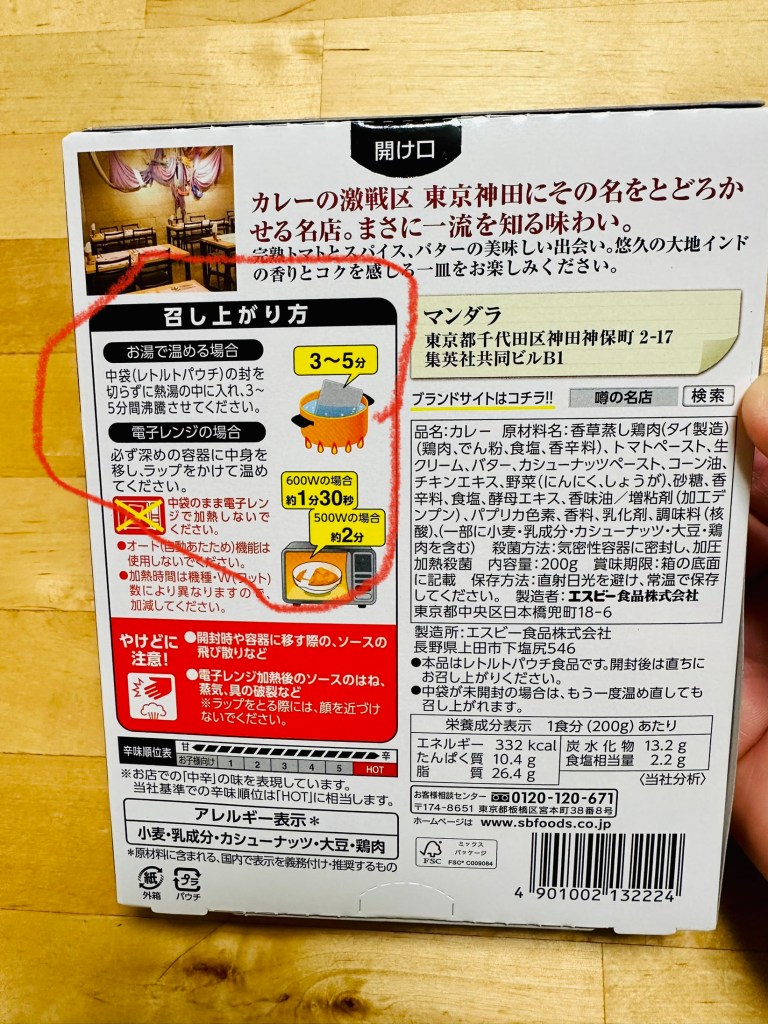 These curry packs are from MUJI and from our local supermarket. The MUJI flavors are butter chicken and chicken tikka masala. The supermarket curry in the box is a cutter chicken from a restaurant in Kanda called Mandara.