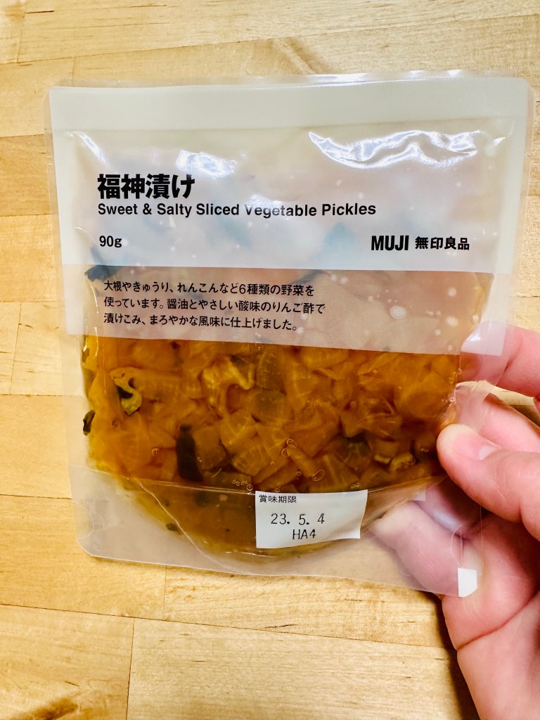 I picked up at MUJI a pack of fukujin zuké which are pickles traditionally served with curry. The pickles will serve about four servings of curry. Store the fukujin zuké pickles in the refrigerator after opening.