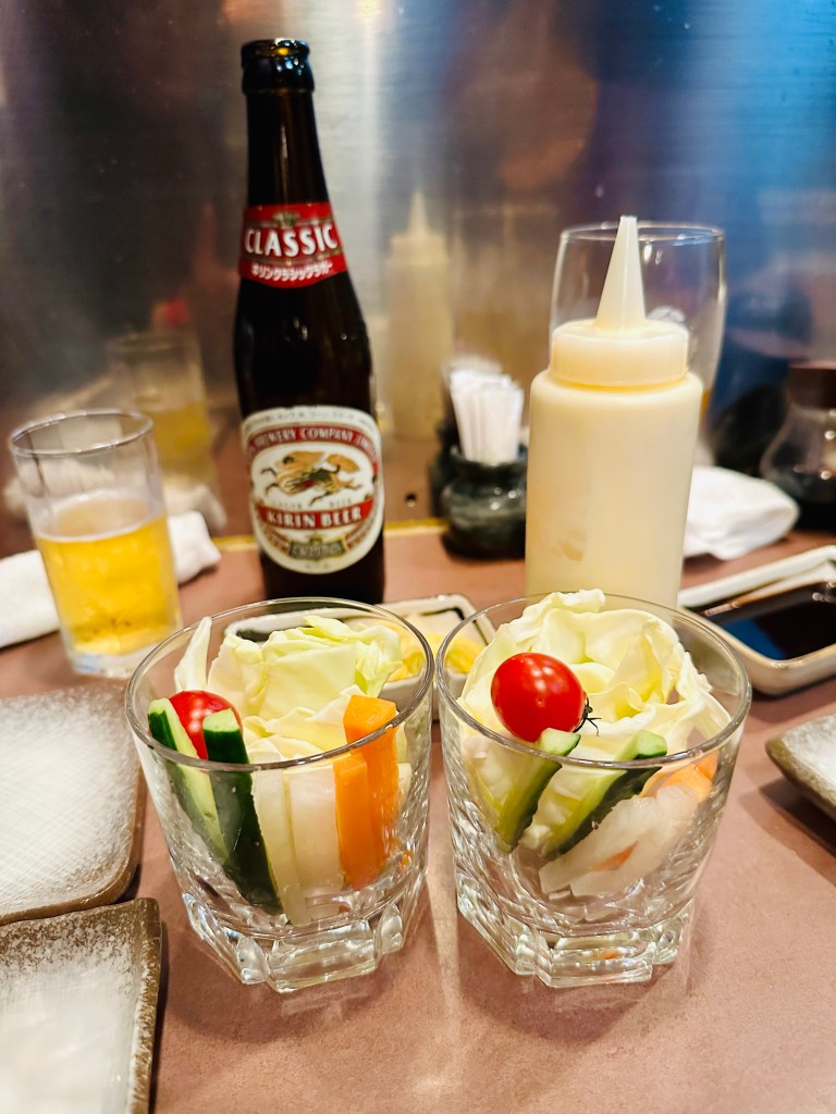 Rampuya is a charming kushikatsu shop near the boisterous Dotonbori area of Osaka. Eight counter seats at a counter. Staff here were very friendly. We went early on a week night so had the whole restaurant to ourselves. The meal starts with crudité served in a short cocktail glass. The raw vegetables were a nice break from the fried skewers.