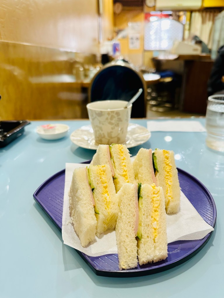 Near Kyōto station is Poco kissaten. I picked it for breakfast as it was open from 6:00 a.m. The morning sando set is a bargain 650 yen ($5) and includes a cup of coffee. The sliver of a shop is in a retro building in a part of the city that is being completely rebuilt so it sticks out.