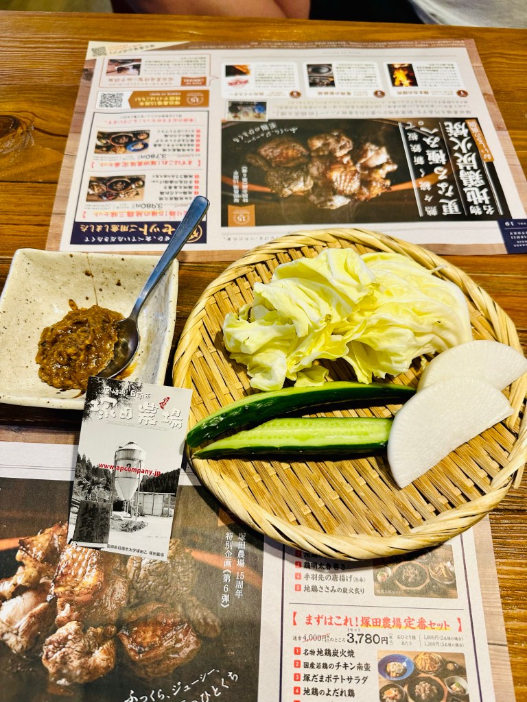 Chicken from Miyazaki prefecture is the theme of this casual izakaya chain called Tsukada Nōjō. Each meal starts with fresh vegetables and a miso dipping sauce – free refills of the miso! Woo hoo.