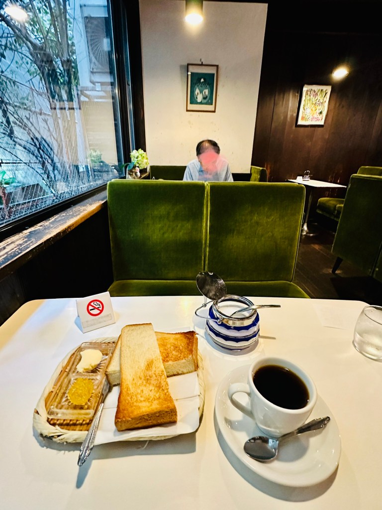 Hotaka kissaten at Ochanomizu Station opened in 1955. I love the velvet forest green booths and dark wood. The coffee here is very smooth. A simple toast, margarine, and orange marmalade is the morning menu.