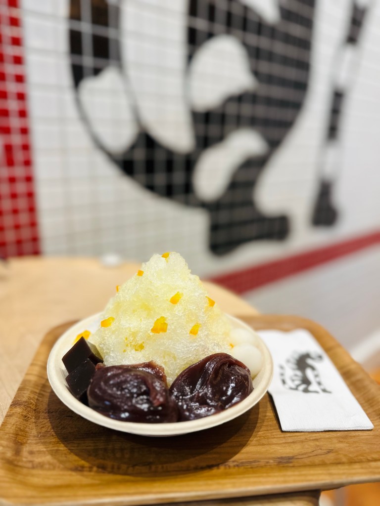 Toraya Japanese confectionary wagashi shop’s rich history can be traced back to the 1600s. While it is a traditional sweets shop I love the modern café serving matcha latté and in summertime kakigōri 氷 shave ice. Here is natsu mikan 夏みかん, a tart and sweet summer citrus and renyū 練乳 sweetened condensed milk. There is also matcha. For an extra 33 yen receive an extra amount of an paste, smooth sweet azuki red bean paste.