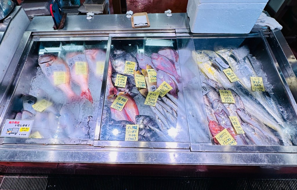 The variety and freshness of seafood is impressive. There is also miso marinated filets, shellfish, air-dried fish, π₯ kamaboko fish cakes, and shiokara fermented seafood. The last two are local specialties.