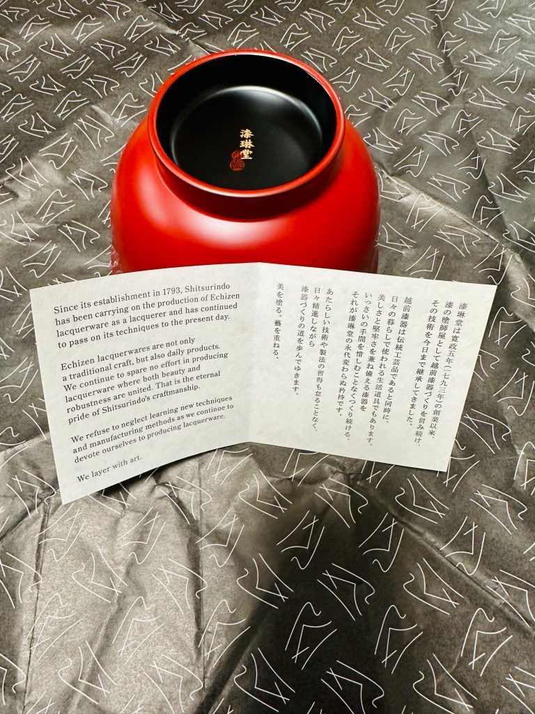 Shitsurindō was established in 1793 in the Echizen area of Fukui prefecture. Echizen is the oldest lacquerware production area of Japan.