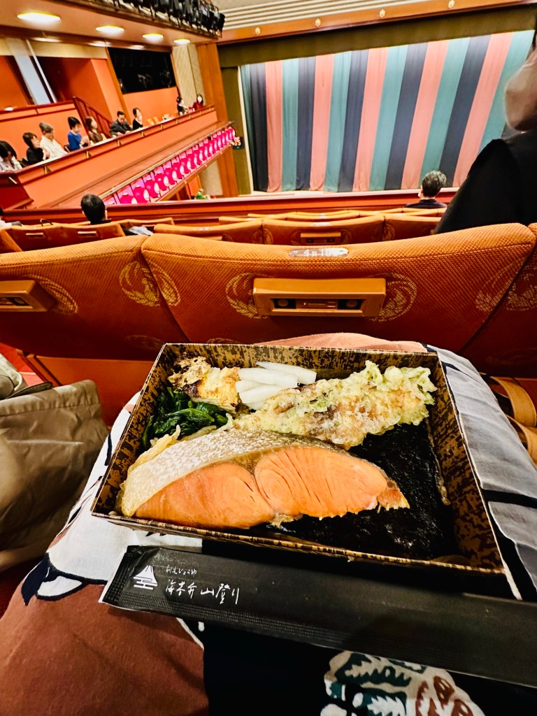 There is a short break between two shows for guests to take lunch or dinner. Dining in the theater is allowed only during this time. Bentō boxes can be purchased in Ginza at one of the depachika at Ginza Six, Mitsukoshi, or Matsuya. I picked up my favorite noriben from @noribenyamanobori and tea from the conbini convenience store. A #tenugui cloth doubles as a luncheon mat on my lap as well as a napkin.