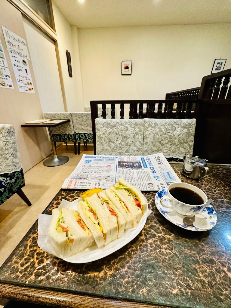 Kissaten are old school coffee shops. The morning service sets are often sandwiches or toast with coffee. I picked it because it was open early in the morning.
