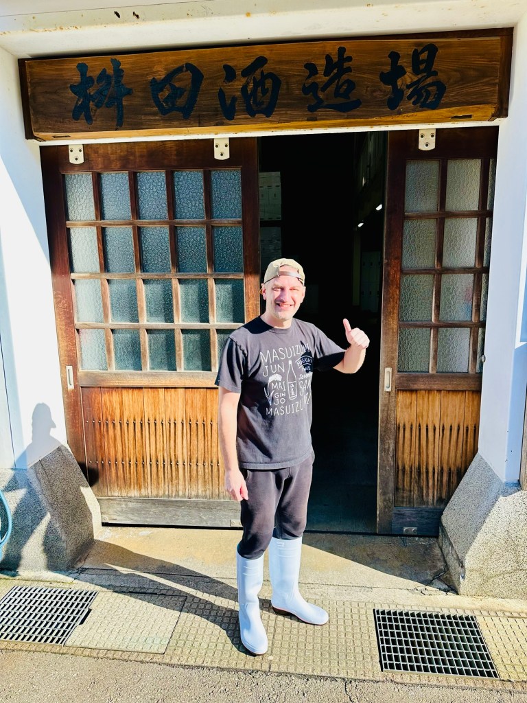 Behind both the sake and beer brewery is 5th-generation Ryuichiro Masuda san of Masuda Shuzo. Masuda san is in the photo standing in front of the wall with the drawing of the Boris, Masuda san, and Jiri. The photo is from a prior visit.