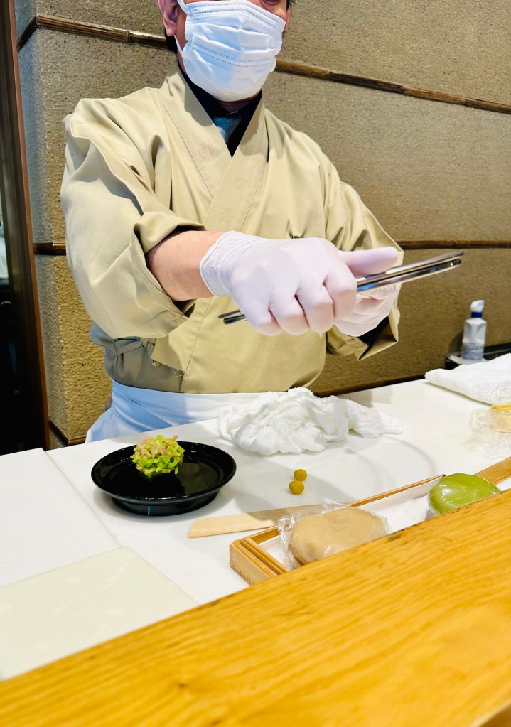A truly unique experience is to watch a shokunin artist create a wagashi traditional confectionary right in front of you at Tsuruya Yoshinobu in Nihonbashi. This style of wagashi, called nerikiri, is made with a malleable white bean paste. The master works very quickly in creating these edible works of art. Guests are seated at a counter, like a sushi counter, but here a wagashi counter.