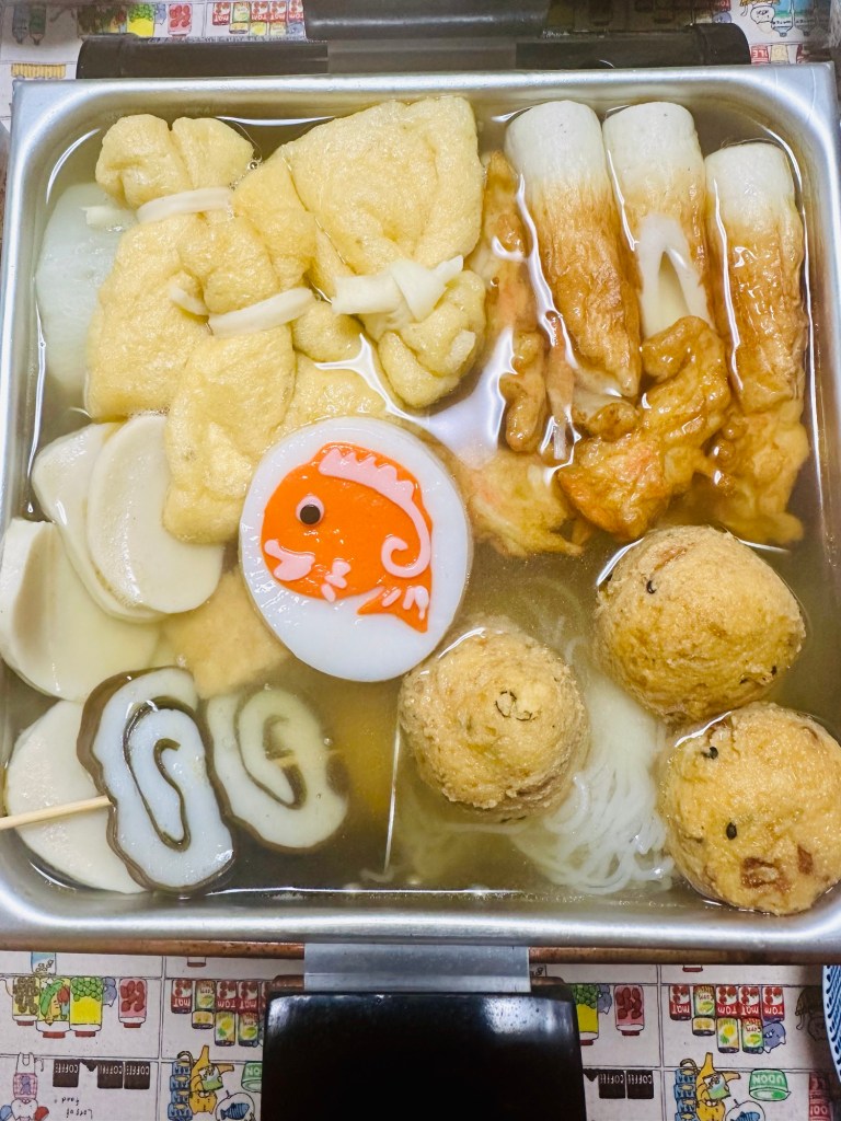 Oden is also a meal that comes together quickly. Simply make dashi and add in the fish cakes. To this I also added fried tōfu, shirataki noodles, boiled eggs, and daikon I had simmered before adding to the hot pot. The only thing I didn’t have in the house is kurumabu, wheat gluten in a round shape like a tire. It is a classic part of the style of oden from Hokuriku. My kid was disappointed. I am a bad mother. 🤣