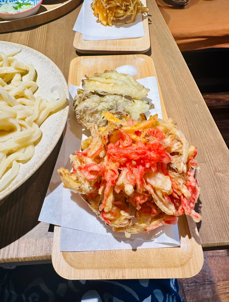 Diners can select how much udon in grams. I recommend the smallest amount unless you are really hungry. We added tempura of maitake mushrooms, and two kakiage cakes of onions and carrots and another that included beni shōga red ginger with vegetables. I love the chewy noodles and the simplicity of the restaurant. It’s a small shop so I imagine it can be busy on weekends and holidays.