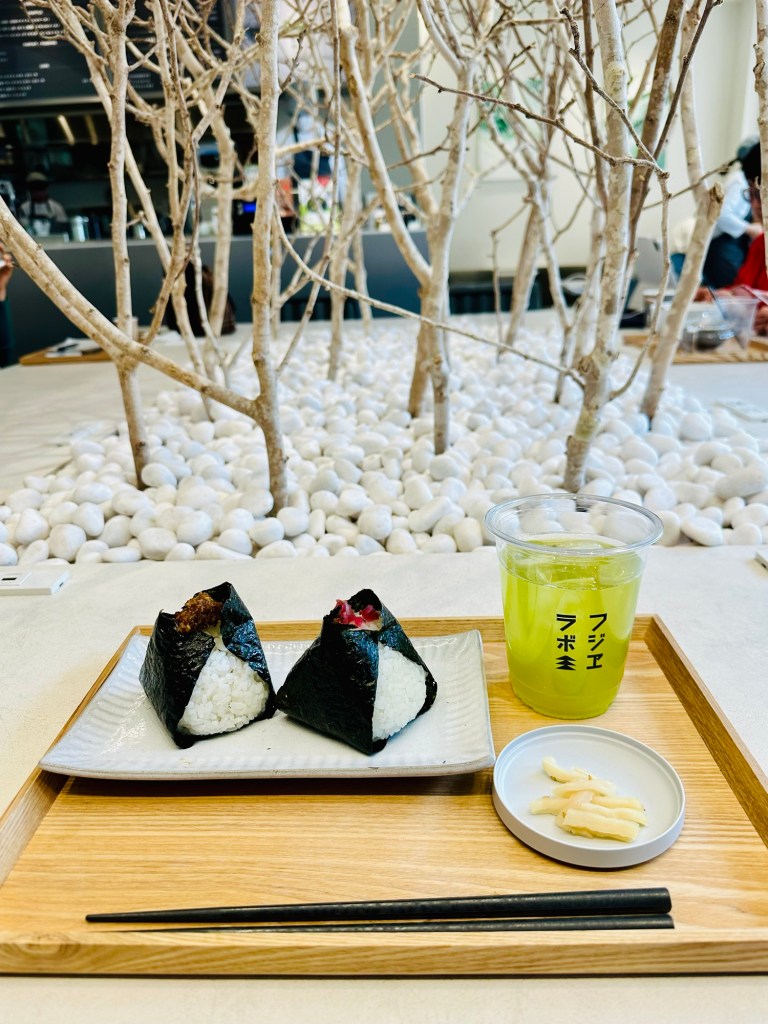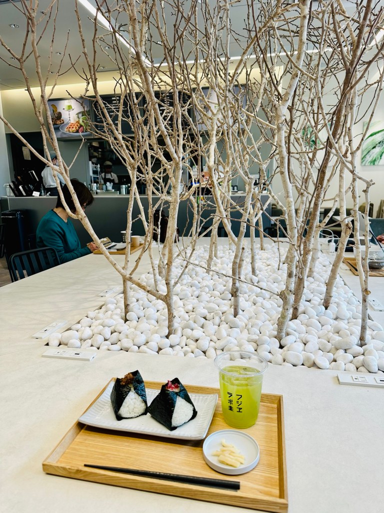 Onigiri breakfast at Fujie Labo at Tachikawa Station. The brightly lit cafe is part of the Yamamotoyama family, Tokyo’s oldest tea shop which dates back 330 years.