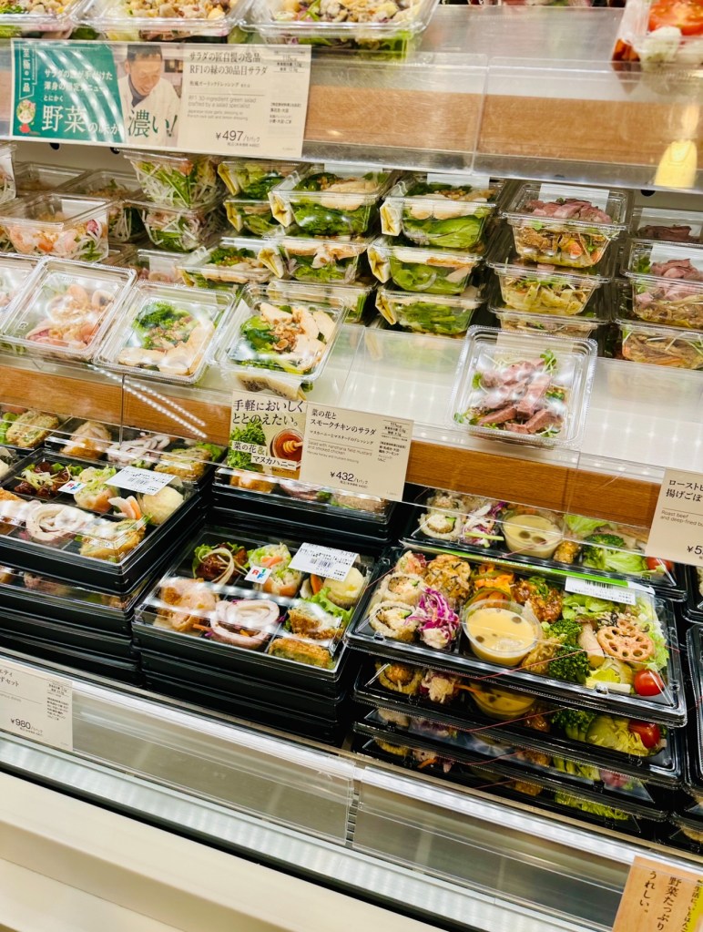 Many of my clients say they feel like they’re not getting enough vegetables while in Japan. I get it. When eating popular Japanese dishes it may be ramen, soba, udon, sushi, yakitori, tonkatsu, and unagi. Which is why I always point out this shop on a depachika market tour. Of course there are vegetables in the Japanese diet, such as sea vegetables in miso soup, tsukemono pickles, or small servings of cooked vegetables – not the salads we find in Western cuisine. There are smaller salads with 1/3 of a day’s worth of vegetables if you want a light snack. Salad dressings are included in the salad kits and a thin plastic separates the toppings from the greens to keep the lettuce from getting soggy. Brilliant!