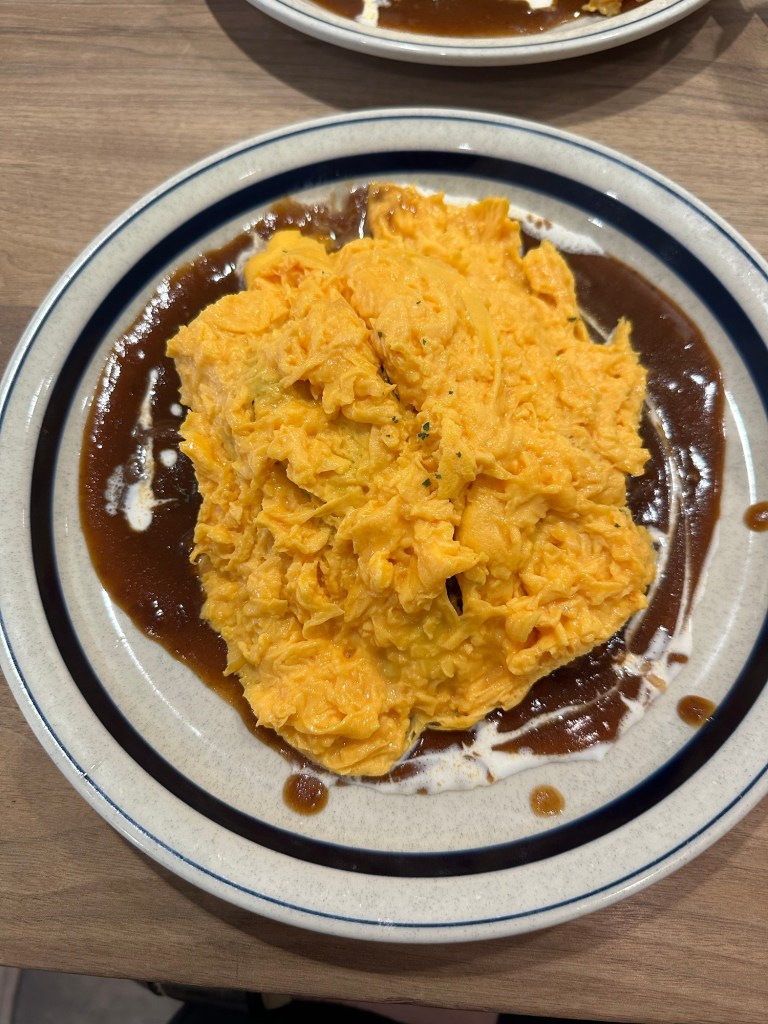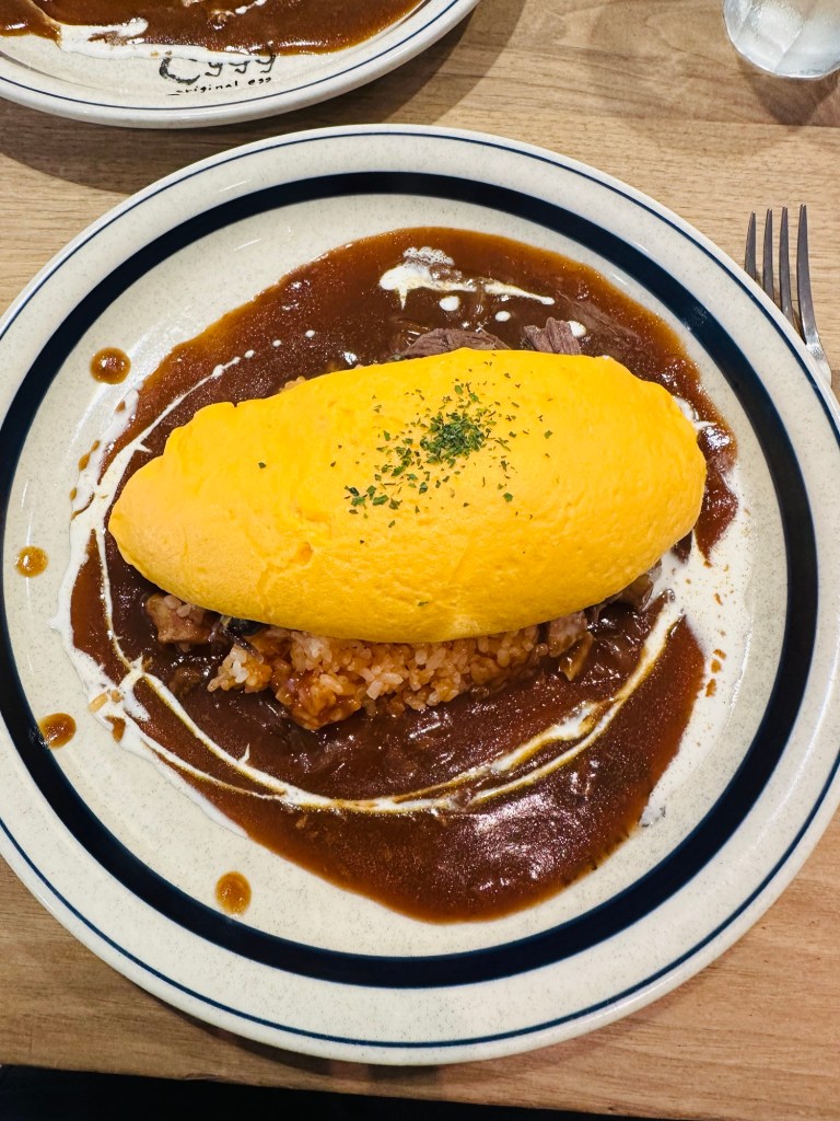 @eggg_kokubunji is famous for fluffy pancakes but we also love the omuraisu. This one with tender beef cheeks and a demi-glace sauce. The knife 🔪 is full so it’s hard to cut into the omelette on top of the ketchup rice. If you’re curious to try the pancakes this is a great spot.