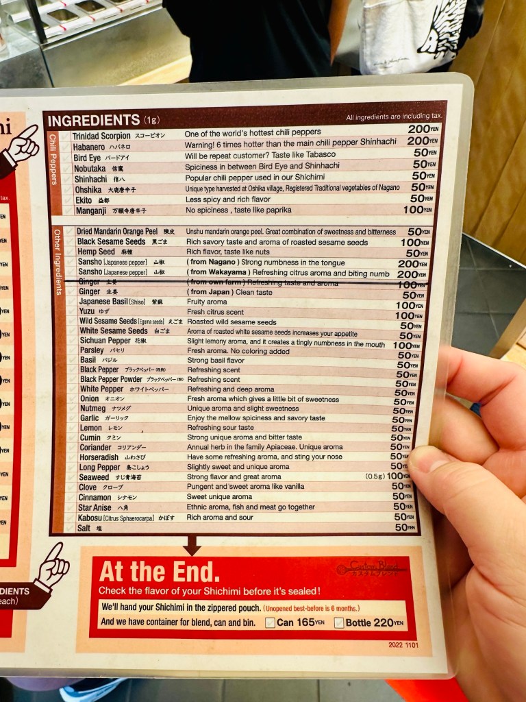 The shop has a standard shichimi that is sold throughout Japan. At their main shop here it is also possible to find cool variations like a Garam Masala spice mixture.