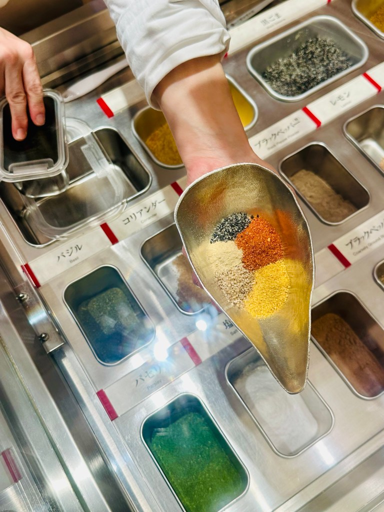 The most fun here is to create an original spice mixture. My kid wanted to make a yuzu based mixture. Staff added our many questions. She recommended not using aonori as the aroma would overpower yuzu.