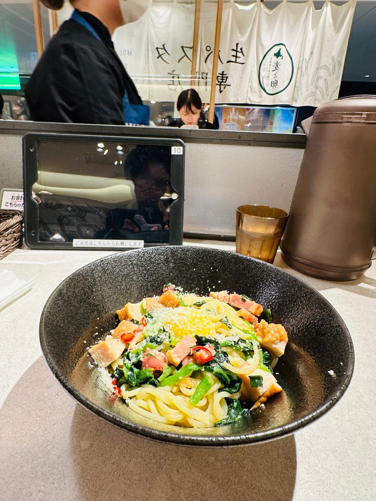 Love these wafu pasta cafes. Quick meals. All the spaghetti dishes are tempting. Mugi to Tomato noodles are made with Hokkaido flour and the noodles are fresh, not dried. This salad and pasta is a bargain ¥1480 ($10).